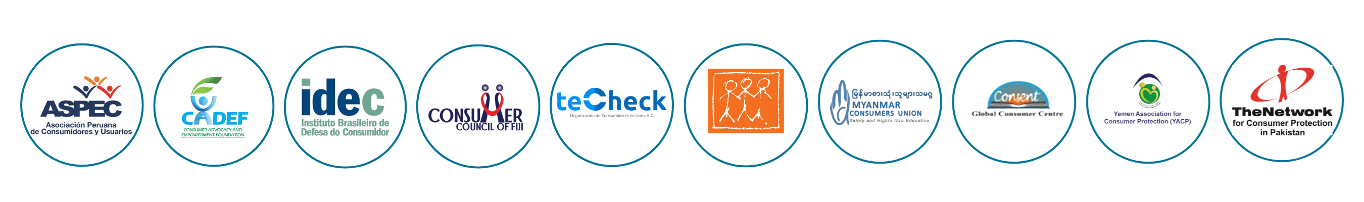 "ANNA" National Association of Consumers Armenia, Acción del Consumidor (ADELCO, Argentina), ADDC-Wadata (Niger), ADECOR - Associação de Defesa do Consumidor (Angola), African Union of Consumers, Algerian Union for Consumer Algeria, Ambio (Costa Rica), Asociación Peruana de Consumidores y Usuarios (ASPEC, Peru), Associação para Defesa do Consumidor (ADECO, Cape Verde), Association Burundaise des consommateurs (Burundi), Association des Consommateurs de l'ile Maurice (ACIM, Mauritius), Association Ivoirienne de Consommateurs (AIC, Côte d'Ivoire), Association pour la Défense de l'environnement et des Consommateurs (ADEC, Senegal), Association pour la Défense des Droits des Consommateurs (ADC, Chad), Benin Santé et Survie du Consommateur, Consumer Advocacy and Empowerment Foundation (CADEF, Nigeria), Centre for Technology Disputes Resolution (Uganda), Citizen Consumer and Civic Action Group (CAG, India), Confeuropa Consumatori Association (Romania), Consumer Awareness Organisation (Nigeria), Global Consumer Centre (CONSENT, Uganda), Consumer Council of Fiji, Consumer Council of Zimbabwe, Consumer Eye Nepal, Consumer Protection Association (CAP, India), Consumer Protection Association of the Gambia, Consumer Voice (India), Consumers Association of Bangladesh (CAB), Consumers Association of Penang (Malaysia), Consumers Korea, Consumers Lebanon, Consumers Union of Tajikistan, CUTS International (India), East Timor Consumers Protections Association- TANE Konsumidor, Educar Consumidores (Colombia), Fair Finance Thailand, Fédération des Associations de Consommateurs de Côte d 'Ivoire (FAC), Fédération Nationale des Associations du Consommateur-FNAC (Morocco), Federation of Malaysian Consumers Associations (FOMCA), Instituo Brasileiro de Defesa do Consumidor (IDEC, Brazil), Indonesian Consumers Organization, International Confederation of Consumer Societies (KONFOP, Russia), Kenya Consumers Organization, Laban Konsyumer Inc. (Philippines), Lembaga Konsumen Yogyakarta Consumers Institute, Indonesia), Liga de Defensa de los Consumidores de Nicaragua (LIDECONIC), Mumbai Grahak Panchayat (MGP, India), Myanmar Consumers Union, Organización de Consumidores y Usuarios de Chile (ODECU), Regroupement pour la défense des consommateurs du Mali, Resource Rights Africa, Rwanda Consumer's Rights Protection Organisation (ADECOR), South Sudan Consumer Protection Organisation, St. Lucia National Consumers Association, Sudanese Consumers Protection Society, Tanzania Consumer Advocacy Research Organisation, Tanzania Consumer Advocacy Society, Tec-Check Organización de Consumidores en Línea (Mexico), The Barbados Consumer Empowerment Network (BCEN), The Network for Consumer Protection in Pakistan, Tribuna Ecuatoriana de Consumidores y Usuarios (Ecuador), Tunisian Organization for Informing the Consumer, Uganda National Health Consumers' Organisation (UNHCO), Via Organica (Mexico), Việt Nam Standards and Consumers Association-VINASTAQ (VINASTAS), Yemen Association for Consumer Protection, Youth Education Network (Kenya).