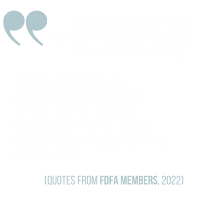 Collectively, these modules cover digital financial services models, regulatory processes, risk management, advocacy strategies, funding plans, sustainable finance, gender mainstreaming, and financial literacy and inclusion.