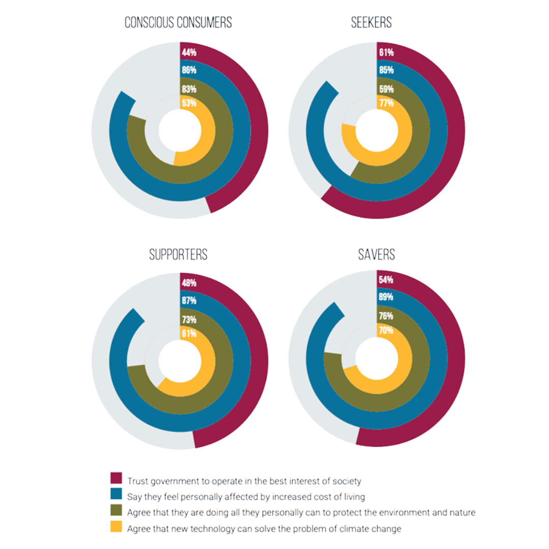 - Conscious Consumers who typically have high feelings of personal responsibility and low trust in government and business.