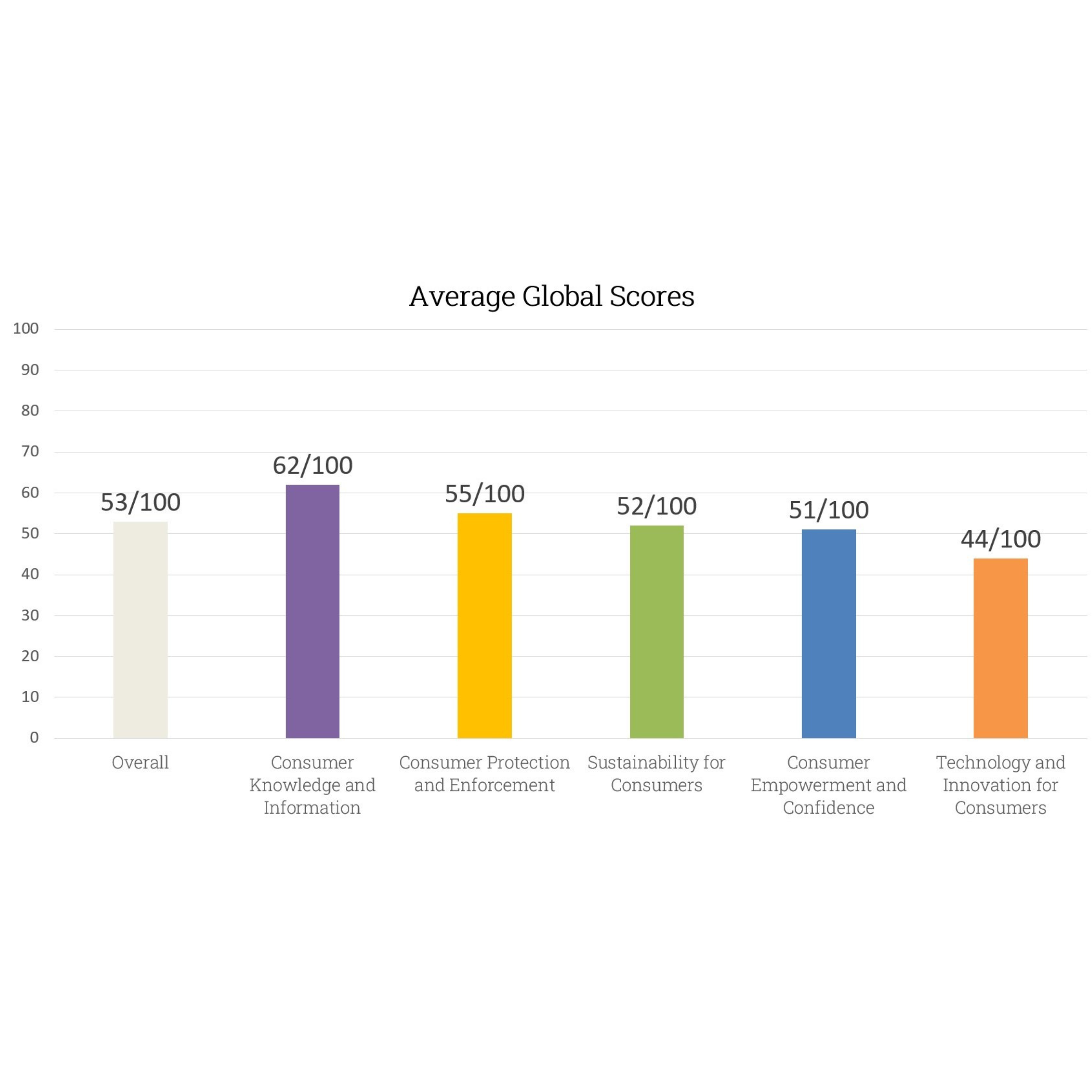 - The average global score for the Index is 53/100; there is still substantial room for improvement across all areas of consumer protection and empowerment.